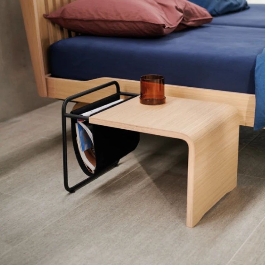 Dit handige Noa tafeltje is de perfecte toevoeging op uw Auping Noa bed! De Noa tafel is voorzien van een magazinehouder. Het tafeltje kan zowel horizontaal als verticaal naast het bed gezet worden. De tafel is vervaardigd van gelaagd beukenhout (multiplex) met eiken fineer en gepoedercoat staal.