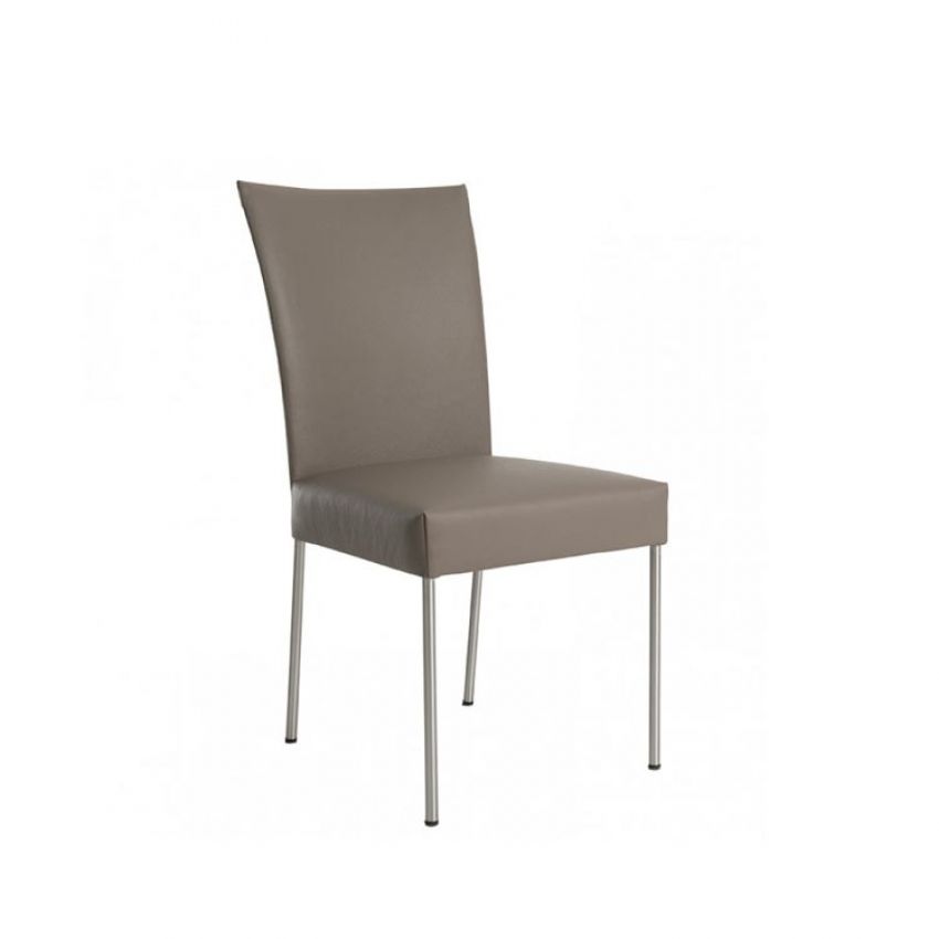 Eetstoel uit de collectie van een Nederlandse fabrikant. Leverbaar in diverse kleuren leder Tendens (zwart, graniet, lava, taupe, blanco en paprika). Frame van rvs.