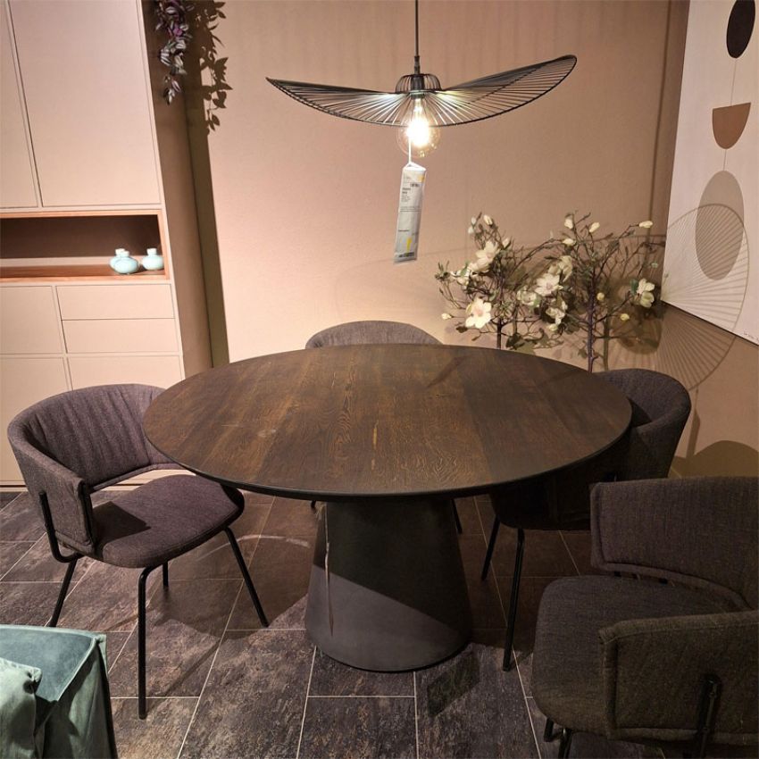 De eetkamertafel Beton Ciré met houten blad is uitgevoerd in de maat 140 cm met een ronde betonnen voet.