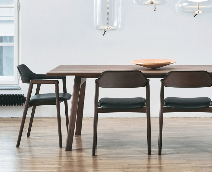 De Challenge eetstoel, ontworpen door het Duitse trio Maly-Hoffman-Kahleyss, is een technisch hoogstandje. Het frame oogt slank en sculpturaal, maar biedt verrassend veel stevigheid dankzij de toepassing van ‘finger joints’ — een zichtbare houtverbinding die zowel functioneel als esthetisch is. De rugleuning heeft een subtiele opening die het verplaatsen van de stoel vergemakkelijkt. De zit is diep en ondersteunend, met een lichte curve die de onderrug omarmt. Challenge is verkrijgbaar in diverse houtafwerkingen en bekledingsopties, en vormt een krachtig statement in zowel residentiële als hospitality-interieurs.