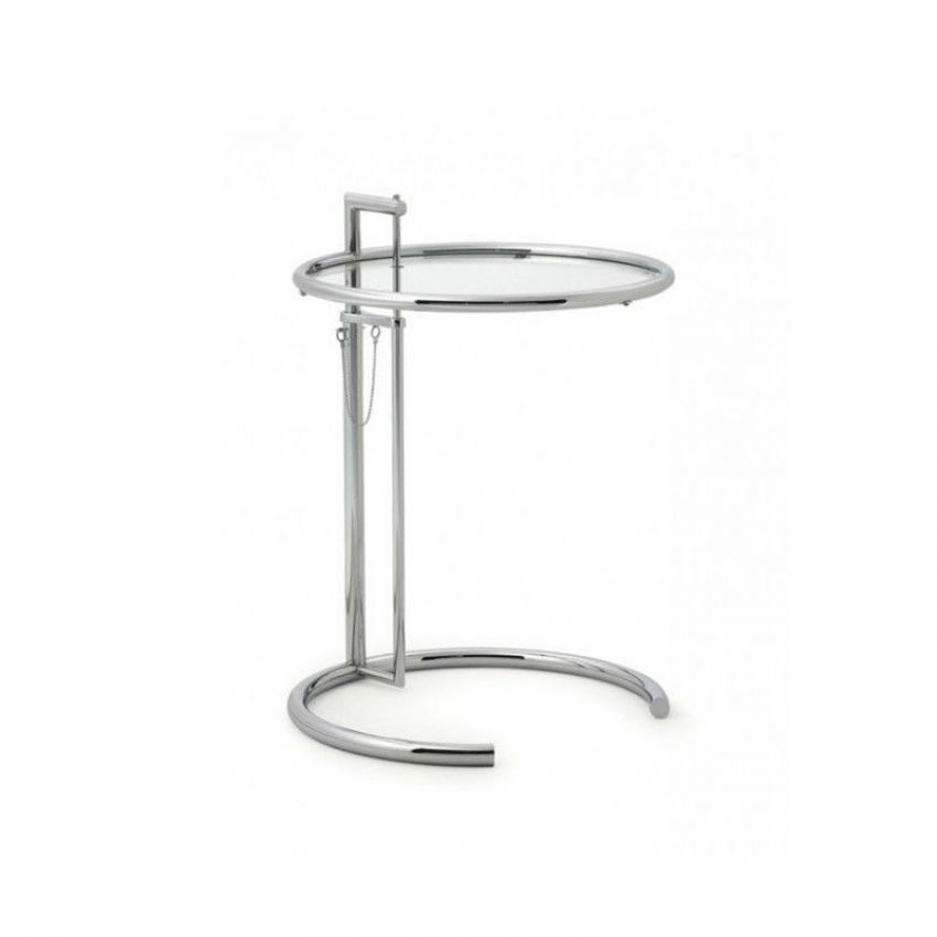 Bijzettafel E-1027 van Classicon heeft een rijke geschiedenis. Het ontwerp van Eileen Gray is een echt designicoon. De naam van het tafeltje is als volgt te ontleden: De 'E' is van Eileen, de '10' is van Jean (haar partner, de 'J' is de tiende letter van het alfabet), de '2' van de 'B' (van Badovici, de achternaam van haar partner). De '7' is van Gray. De bijzettafel is in hoogte verstelbaar en uitgevoerd in chroom en helder kristalglas. Hoogte van de tafel is 64 cm en de doorsnede is 52 cm.