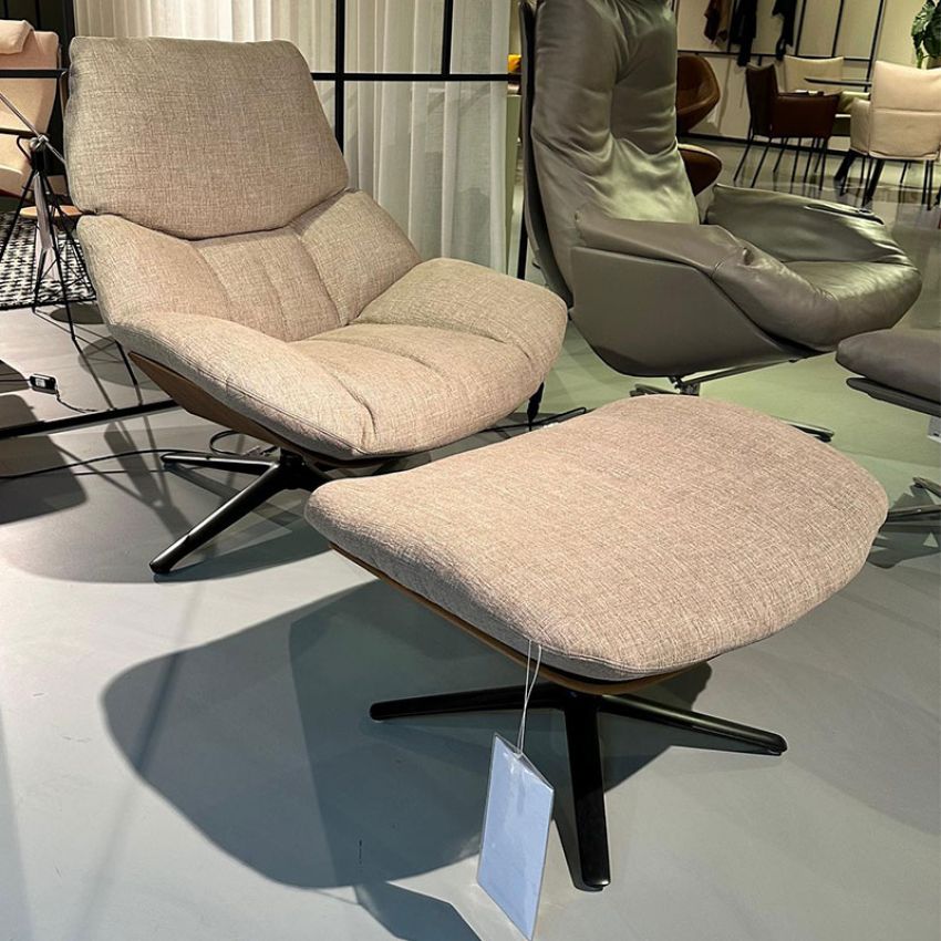 Fauteuil + Hocker Shrimp van het merk COR uitgevoerd in noten en stof.