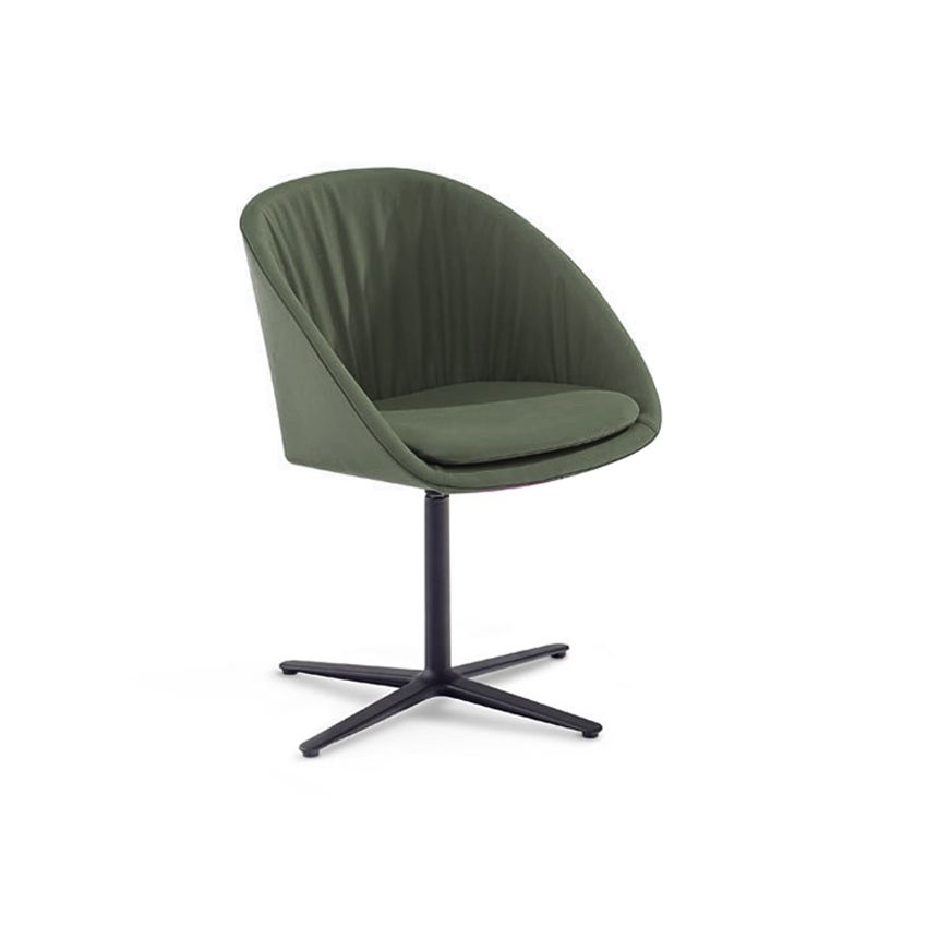 Deze kuipstoel laat niets te wensen over wat betreft het zitcomfort. De licht flexibele rugleuning en een extra geplaatst zitkussen zorgen voor een behaaglijk gevoel. De nonchalante draperie zorgt voor een ontspannen zitgenot en formele finesse. De Dan is leverbaar met twee verschillende stoelframes. De 2043 is uitgevoerd met een draaibare zitting op een zwart gecoat aluminium 4-ster onderstel.