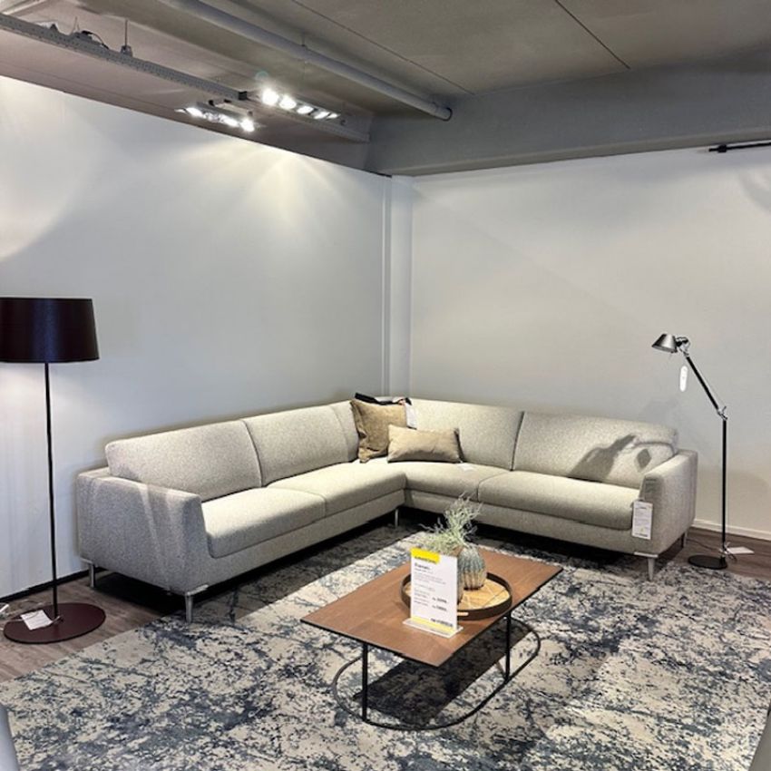 De Evidence by Leolux Brisa hoekbank is uitgevoerd in de stof Charm Stork met een onderstel in gepolijst aluminium. Het meubel komt met één extra sierkussen.