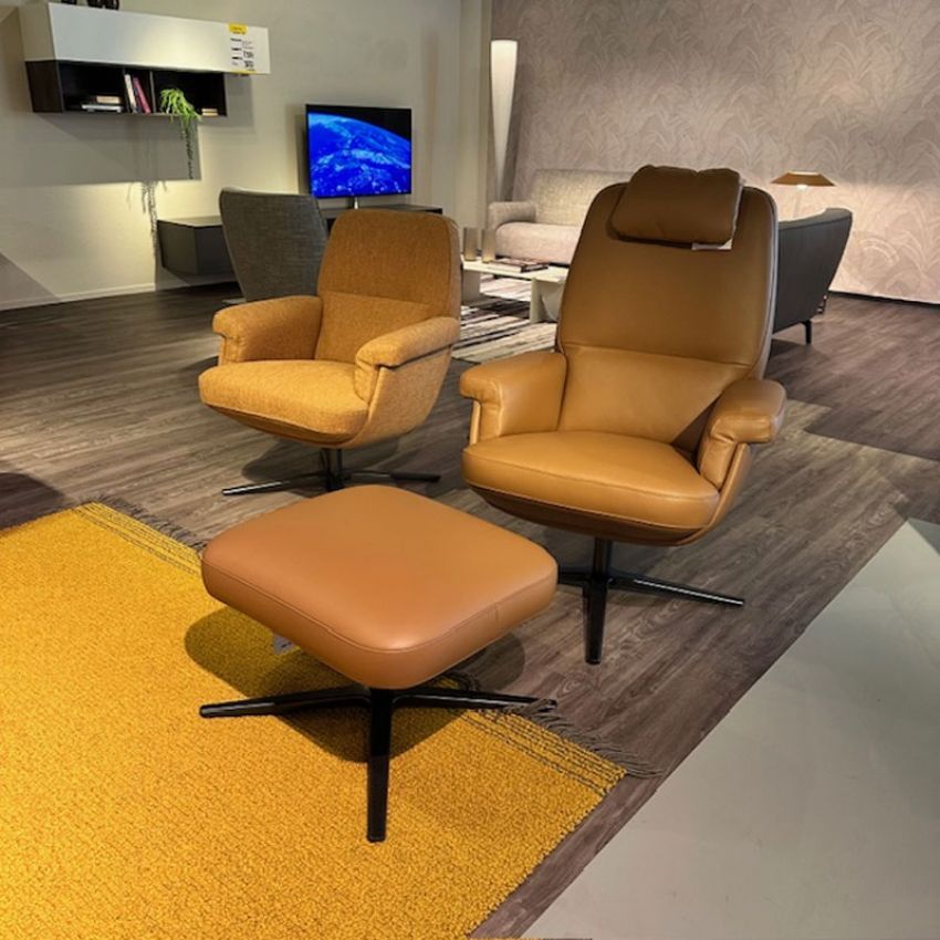 De Evidence by Leolux Entro set bestaat uit twee fauteuils en een hocker. Één fauteuil (incl. hoofdkussen) en hocker zijn bekleed met leder Senso Camel met een onderstel in Nuit Silk en één fauteuil is bekleed met de stof Elva Camel.