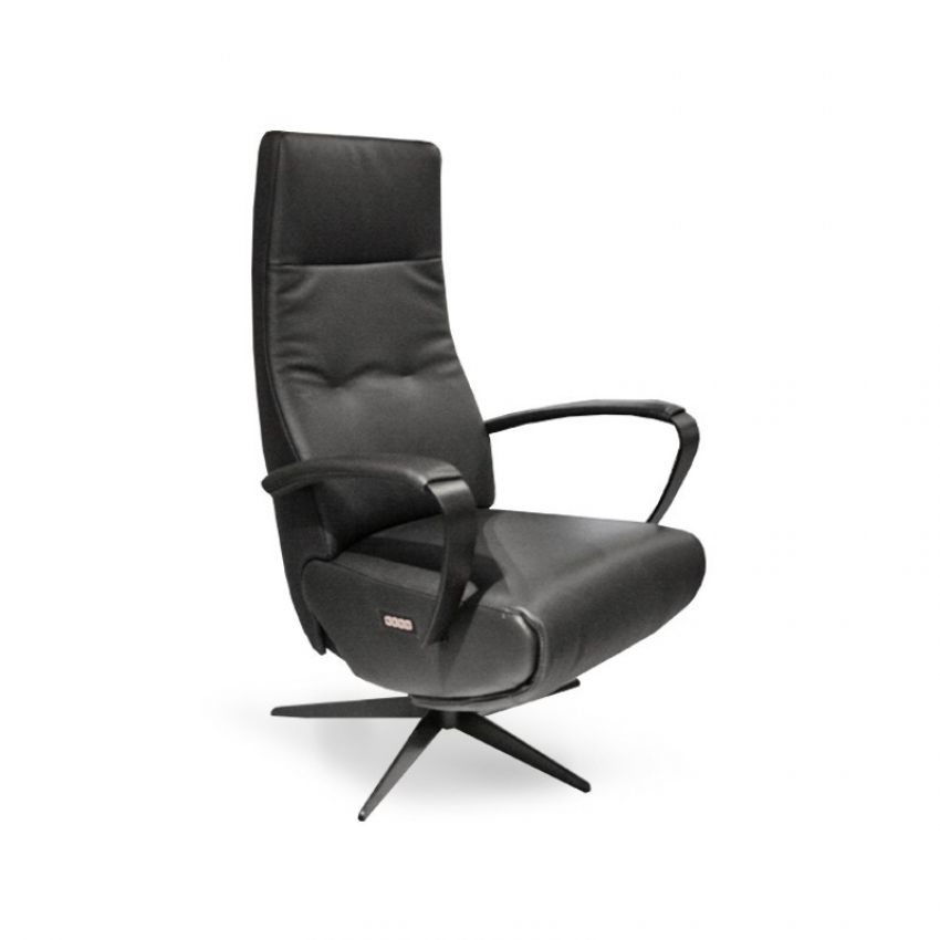 Deze stijlvolle draaifauteuil is opgebouwd uit een stevige stervoet, royale zitting, hoge rugleuning en open armleuningen. Deze fauteuil is leverbaar in diverse afmetingen, met metalen delen in RVS of zwarte lak en diverse soorten lederen bekleding. Dit comfortabele ontwerp is voorzien van een 3-motorig systeem met accu.