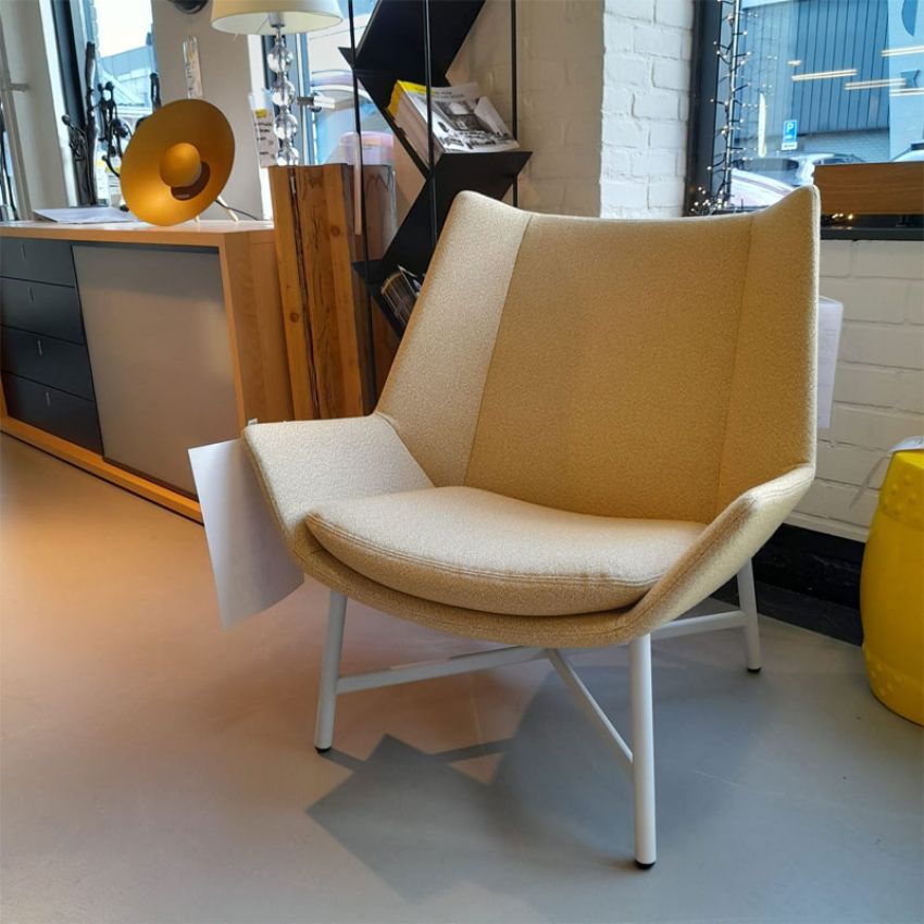 De Gelderland 10020 fauteuil is uitgevoerd in een combinatie van Twinwool 96 en een grijs onderstel.