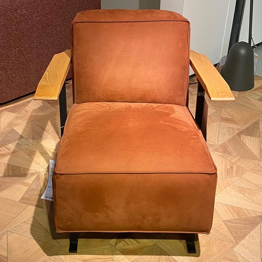 De Gelderland 6401 'Woody' fauteuil is uitgevoerd in leder Colorado 2601 in combinatie met een eiken armlegger.