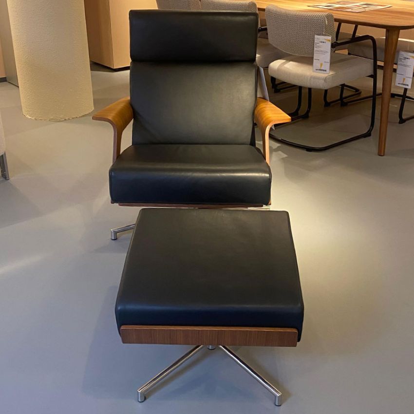 Fauteuil en hocker De Kaap van het merk Harvink is uitgevoerd in leder sattel zwart. De zitschaal en armlegger zijn uitgevoerd in noten. Het onderstel is gemaakt van geschuurd chroom.