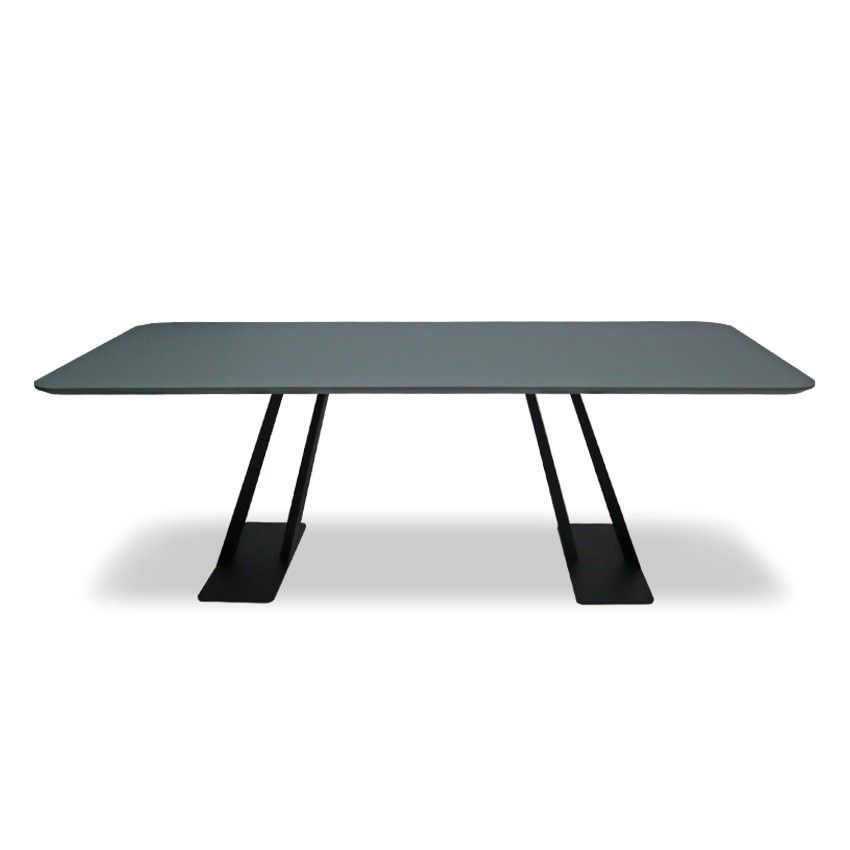 Eettafel Tosca van Harvink zweeft op twee luchtige poten met een verfijnd, verjongd blad en afgeronde hoeken. Het tafelblad heeft daardoor een vriendelijke vormgeving. Het blad is leverbaar in diverse afwerkingen noten of eiken of als getoond in Fenix grijsgroen. Een bijzondere en eigentijdse tafel, tevens ideaal in gebruik te nemen als vergader- of werktafel.