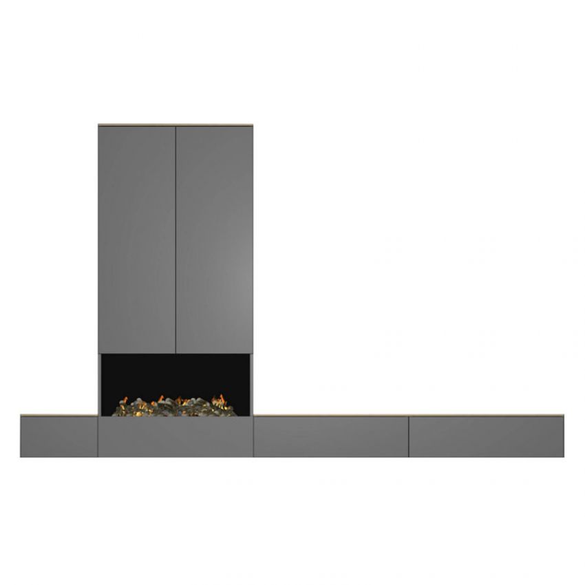 Interstar 2100 TV-meubel voorzien van luxe Optimyst Openhaard. De kast is uitgevoerd in een combinatie van Essen Fineer krijtwit (bovenzijde) en Zacht Grijs (vooraanzicht). De kast staat fabrieksnieuw in ons magazijn en kan snel geleverd worden.