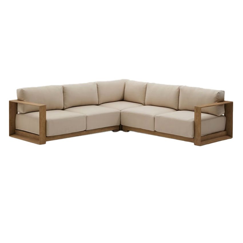 De Ambra 5-zitshoekbank van Kave Home is gemaakt van massief acaciahout met een klare afwerking en combineert strakke lijnen met zorgvuldig gedefinieerde hoeken. Het ontwerp zorgt voor een tijdloze en natuurlijke uitstraling die moeiteloos in diverse ruimtes past.
