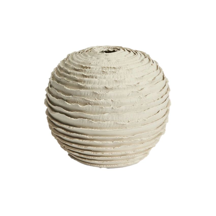 Het oppervlak van de vaas wordt omlijst door fijne horizontale groeven, die zorgen voor een subtiel spel van licht en textuur en een authentieke uitstraling geven.