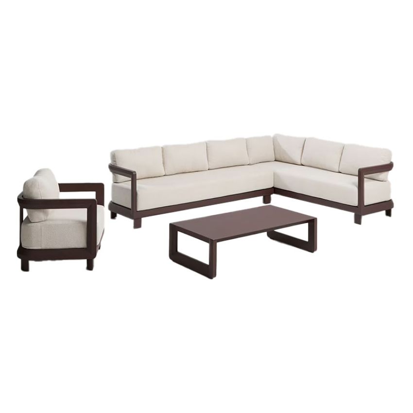 De Nerano outdoor loungeset van Kave Home combineert comfort en duurzaamheid in een eigentijds ontwerp voor buiten. De set bestaat uit een ruime 5-zits hoekbank, een fauteuil en een bijpassende salontafel, uitgevoerd in licht en sterk aluminium dat bestand is tegen intensief gebruik.