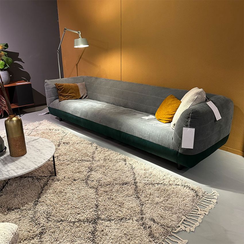 De Label Cocoon 4-zitsbank is uitgevoerd in een combinatie van de stof Stonewashed Linen Jade (binnenzijde) en leder Elite Emerald (onderzijde).