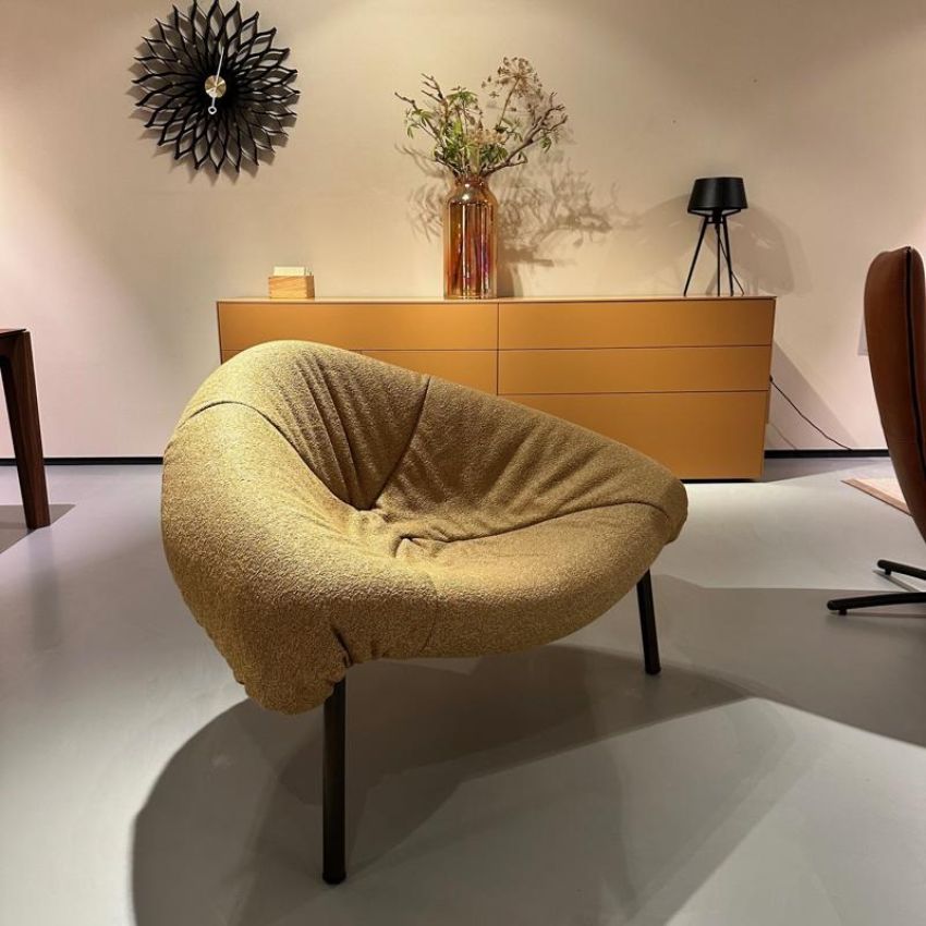 De Label Tripoli fauteuil is uitgevoerd in de stof Boucle Q532 Ocre met een onderstel in de kleur Bronze Brown.