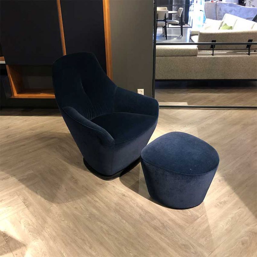 De Leolux Cantate fauteuil en hocker zijn uitgevoerd in de stof Lucir 310 Lapis.