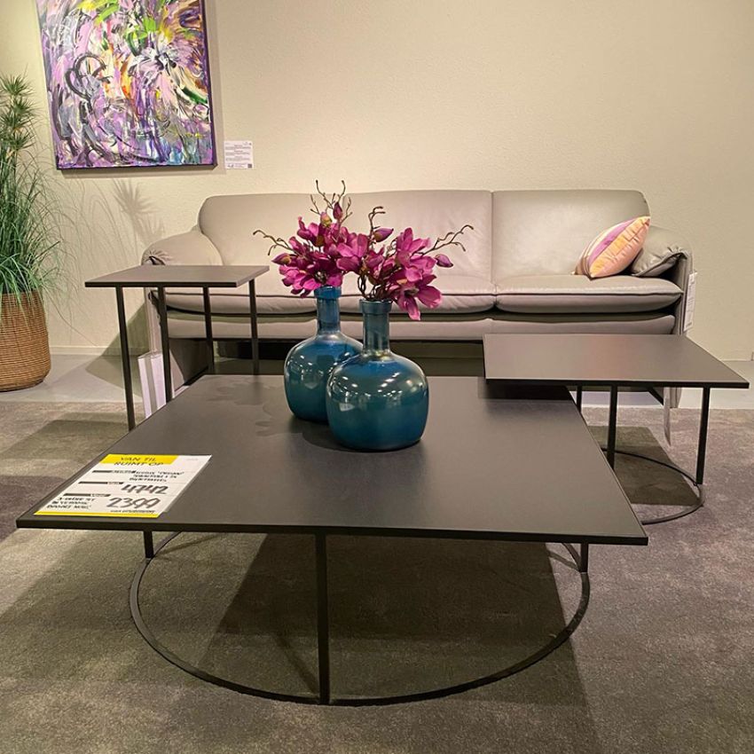 De Prismo salon- en 2 bijzettafels van Leolux uitgevoerd in ceramic basalt noir en Irom Moss.