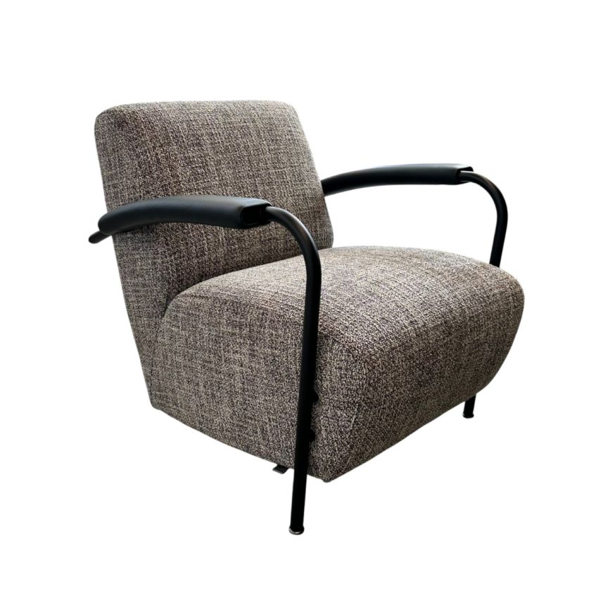 Leolux Scylla fauteuil uitgevoerd in een combinatie van de stof Migo 01 Capitan en leder Senso 1000 Black (armleggers).