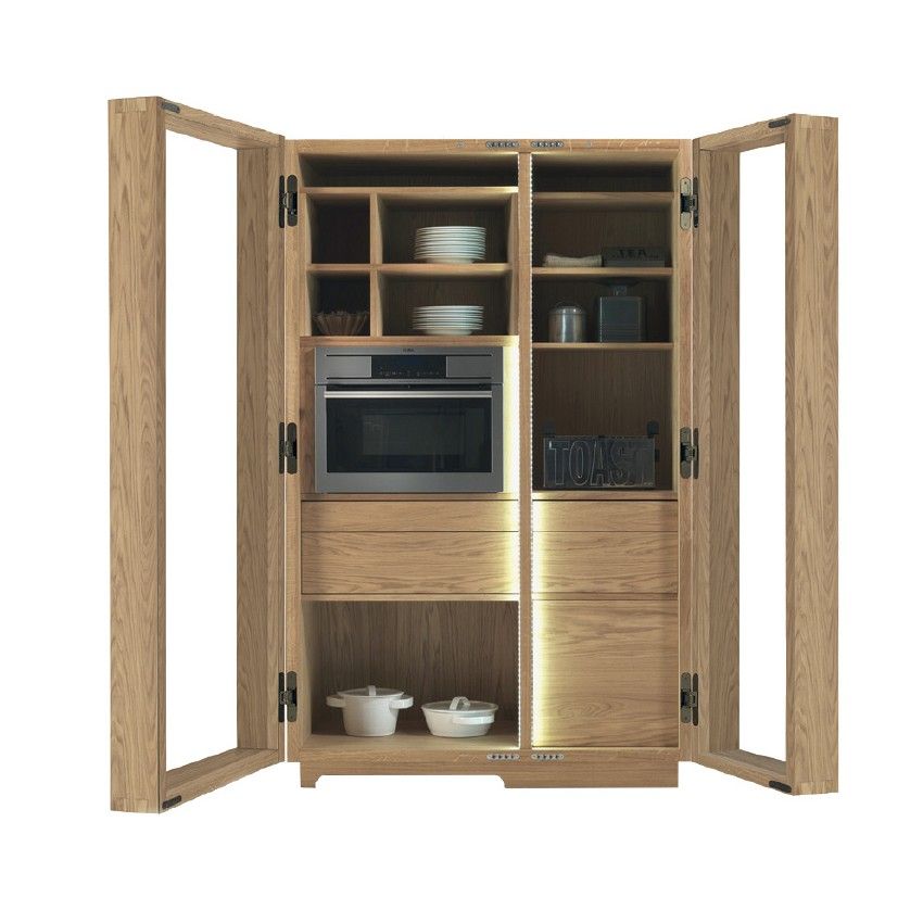 De Cambusa-serie is een prachtige houten kastenserie voor in de keuken en eetkamer. De multufunctionele Cambusa opbergmeubelen zijn gemaakt van massief hout. De Cambusa Cook Glass beschikt over dubbele glazen deuren die 180° openen. Ontworpen als keukenblok, met binnenin de mogelijkheid om kleine elektrische apparaten in te voegen (Jumbo-versie). De binnenkant wordt verlicht door LED-strips, automatisch geactiveerd via sensoren wanneer de deuren worden geopend.