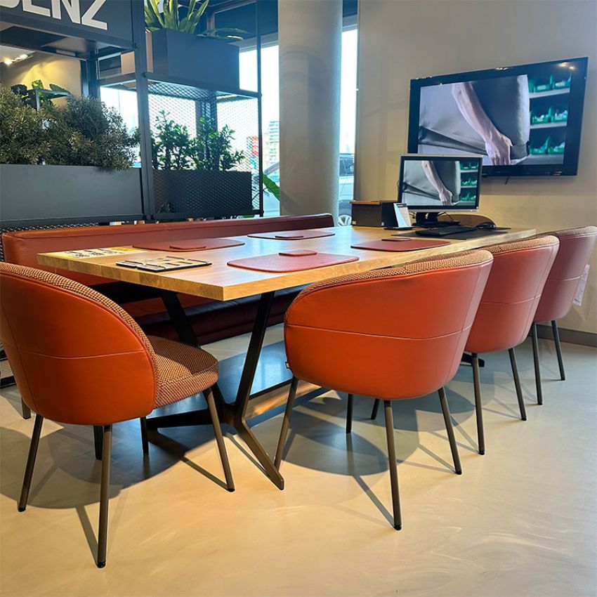 De Rolf Benz RB 921 eetkamertafel is uitgevoerd in een combinatie van staal met transparant gelakt eikenhout.