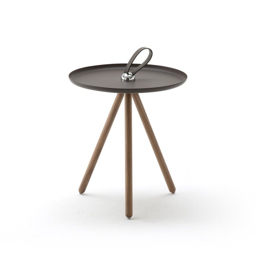 Bijzettafel RB 973-110 is een eigentijds design naar ontwerp van Pascal Bosetti voor het merk Rolf Benz. Deze tafel is opgebouwd uit een onderstel in massief noten en een blad in de kleur grijsbruin (RAL 8019). Het tafeltje is afgewerkt met een kernlederen lus in donkerbruin.