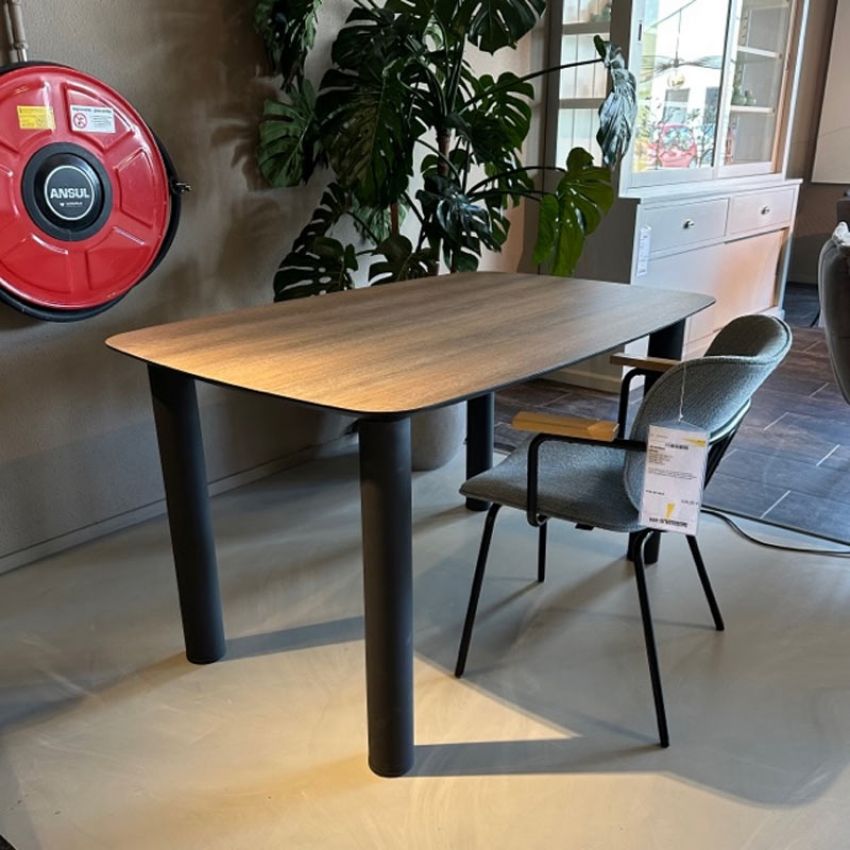 De Sumisura Piedra eetkamertafel is uitgevoerd in een bootsvorm met een blad in HPL Italian Oak. Het onderstel is uitgevoerd in ronde (8,9 cm doorsnede) poten in een zwarte kleur.