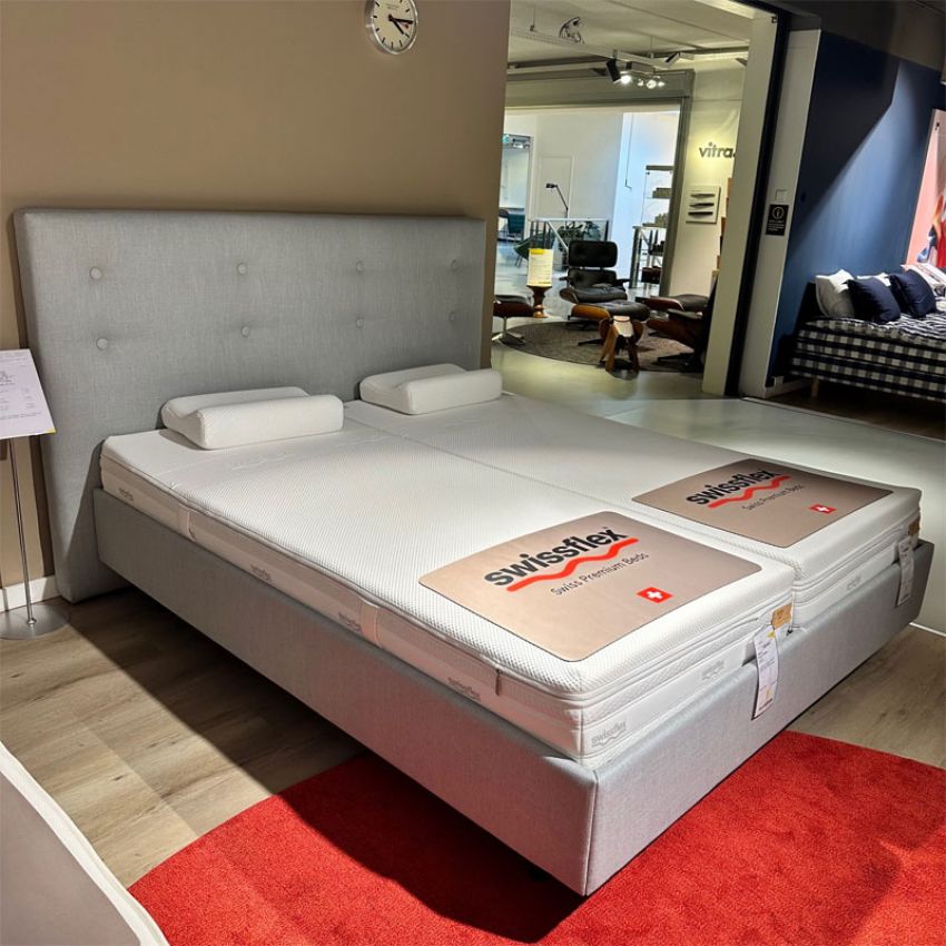 Het ledikant Click is uitgevoerd met een hoofdbord type Madrid (180 cm x 133 cm), lattenbodem uni 14 vlak en voorzien van twee Versa 22 Geltex matrassen (90 x 210 cm).