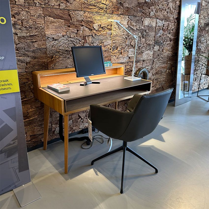 Het Team7 Sol bureau is uitgevoerd in een combinatie van eikenhout en antracietkleurig leder.