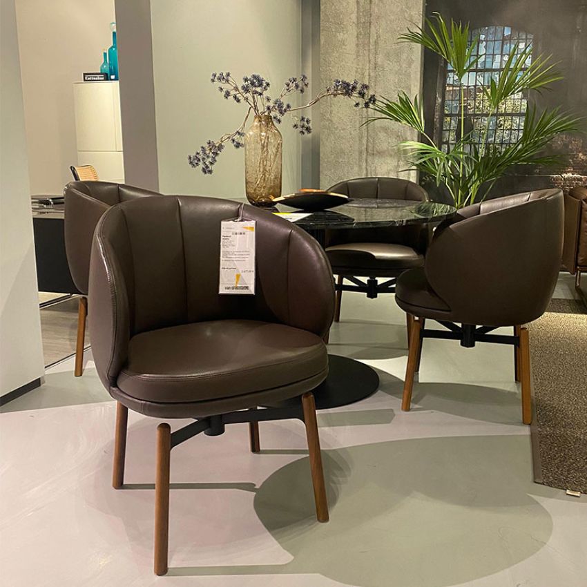 De set van 4 Wittmann Vuelta eetfauteuils zijn uitgevoerd in leder Toro cafe. Onderstel is uitgevoerd in noten.
